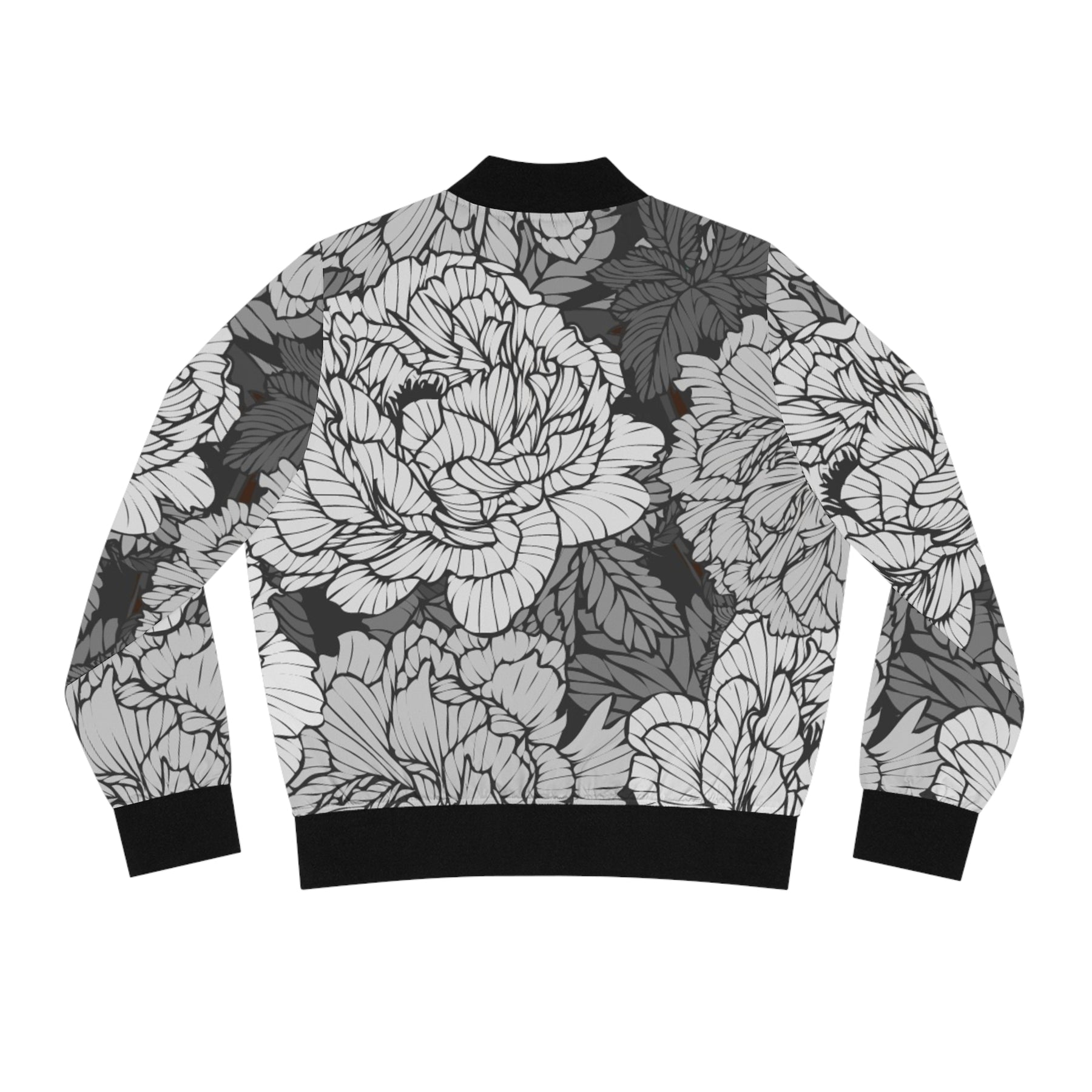 Lightweight and lively, this bomber brings peonies into motion. Softly structured shoulders and a stand collar frame the blooms, while black ribbed cuffs and hem keep the silhouette crisp. Slip your hands into the angled front pockets between walks through city gardens or after a morning coffee — the jacket moves with you, not against you. The copper zipper clicks shut with a confident, tactile sound; the black interior makes the printed petals pop. Wear it on cool spring mornings, gallery openings, or when you want a floral note without being delicate. It’s a wearable bloom that balances bold patterning with everyday ease.