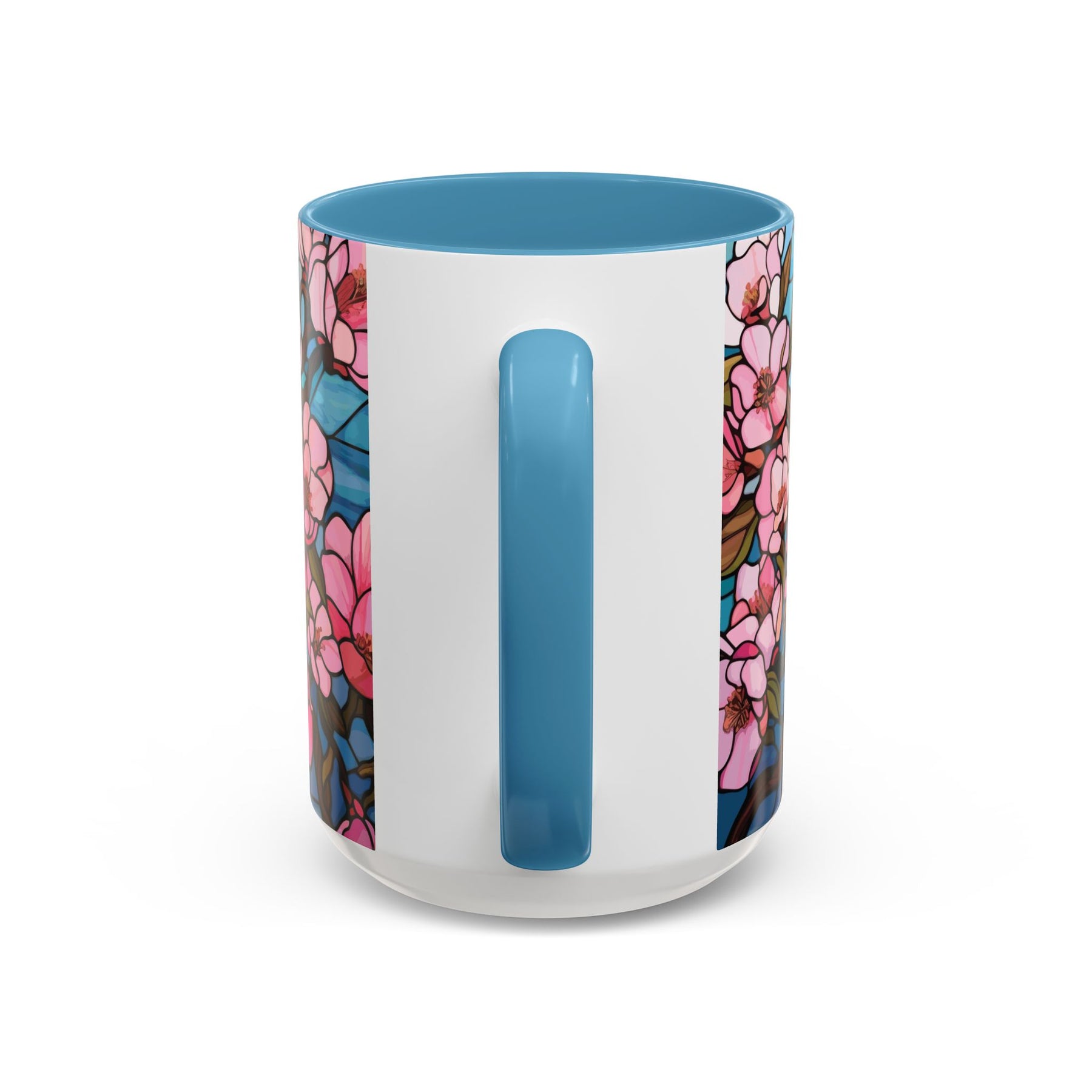 Sip mornings that feel like a walk through an orchard in bloom. This ceramic accent mug wraps a stained-glass–style pattern of delicate pink blossoms against a clear blue sky around a glossy white body with a soft pink interior and handle. It brings quiet, floral energy to a desk, kitchen shelf, or bedside table—warm tea, strong coffee, or a cocoa ritual becomes a moment to pause and notice color, line, and calm. The sturdy C-handle and glossy finish make it comfortable to hold and easy to keep bright; the vibrant print keeps its clarity through everyday use. Thoughtful color contrast makes the blossoms sing even from across the room.